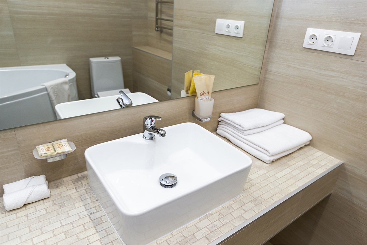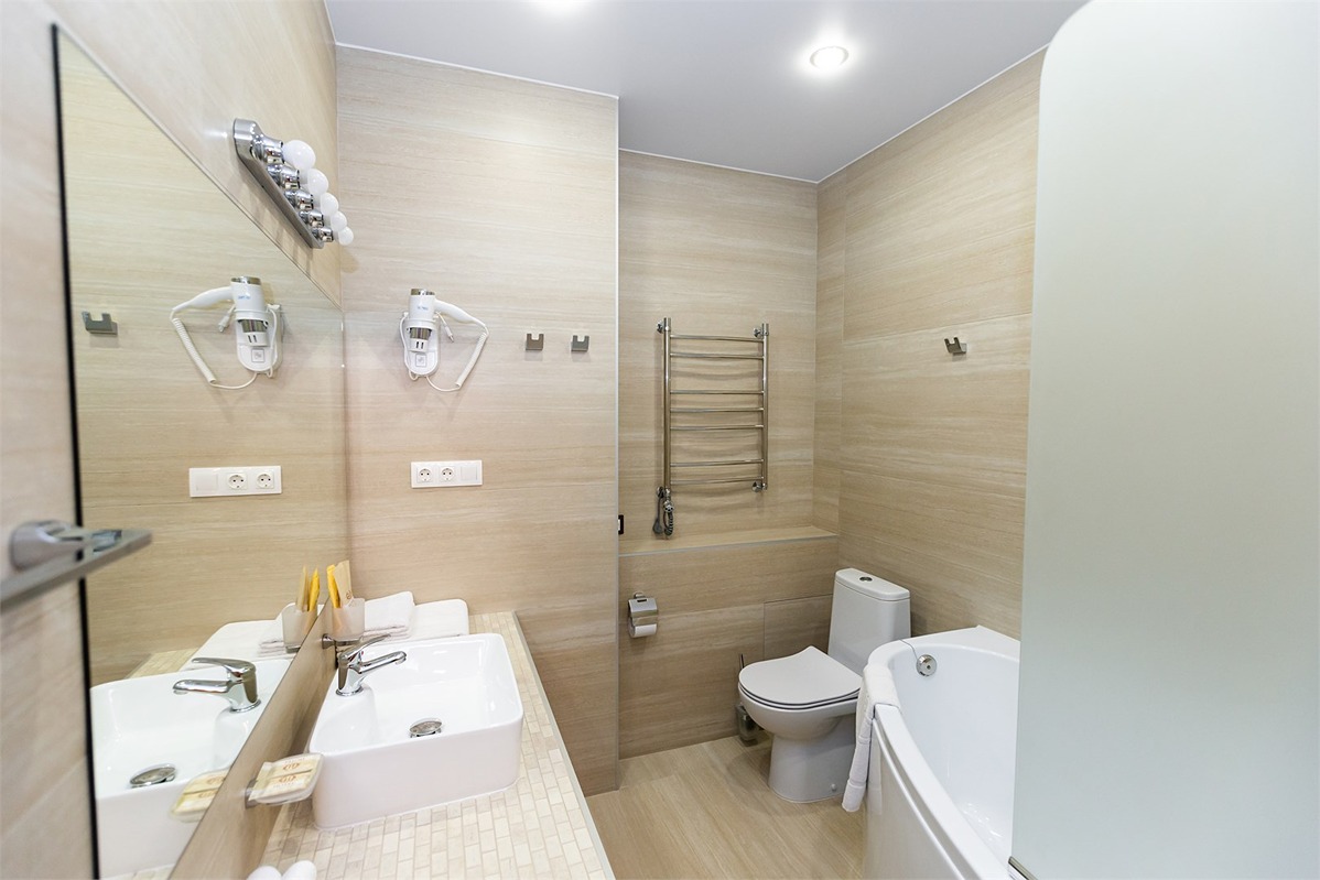 - Санузел: с ванной, с душем, тапочки, туалетные принадлежности, фен, халат