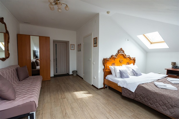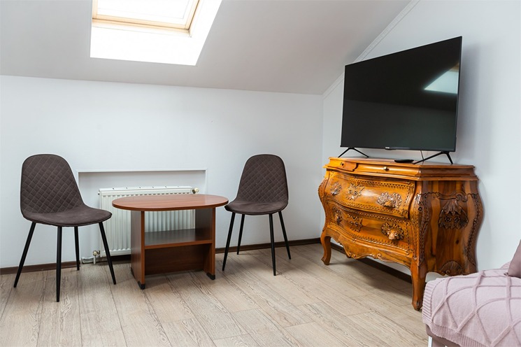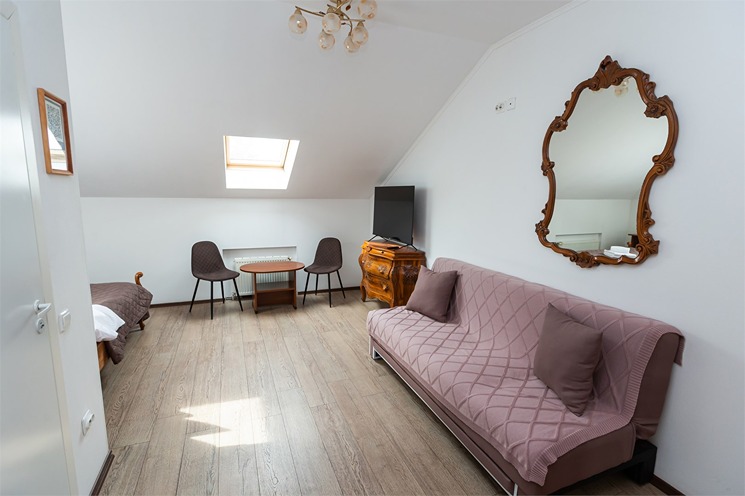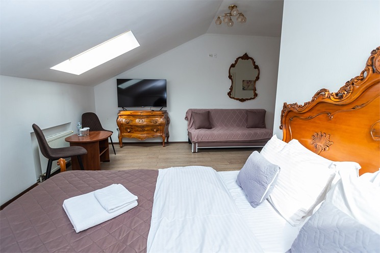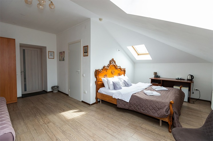 | Люкс 2-местный Мансардный | 32 кв.м. | 2 чел. | Мебель (кровать двуспальная, стол, стулья, шкаф), Оборудование (мини-холодильник, телевизор, телефон... | |