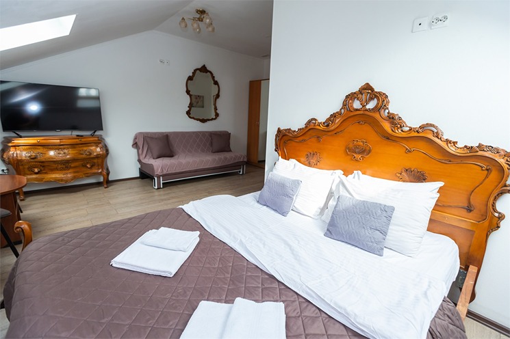 | Люкс 2-местный с джакузи | 36 кв.м. | 3 чел. | Мебель (диван раскладной, кровать двуспальная, стол, стулья, шкаф), Оборудование (мини-холодильник,... | |