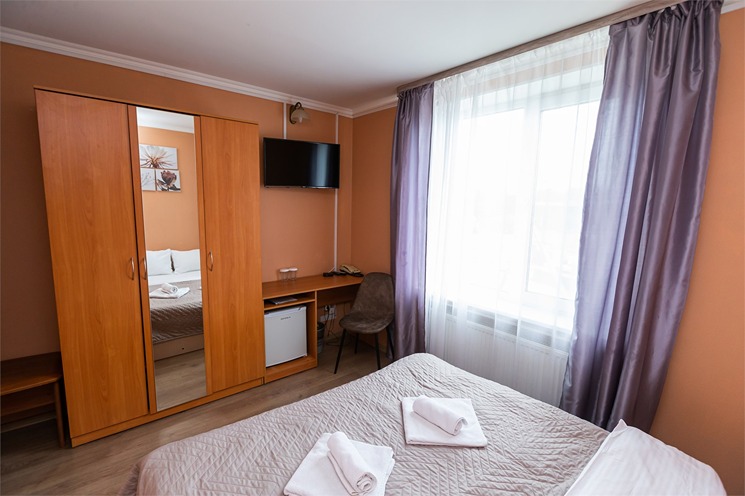 | Улучшенный 2-местный | 14 кв.м. | 2 чел. | Мебель (кровать двуспальная, стол, стул, шкаф), Оборудование (мини-холодильник, телевизор, телефон,... | |